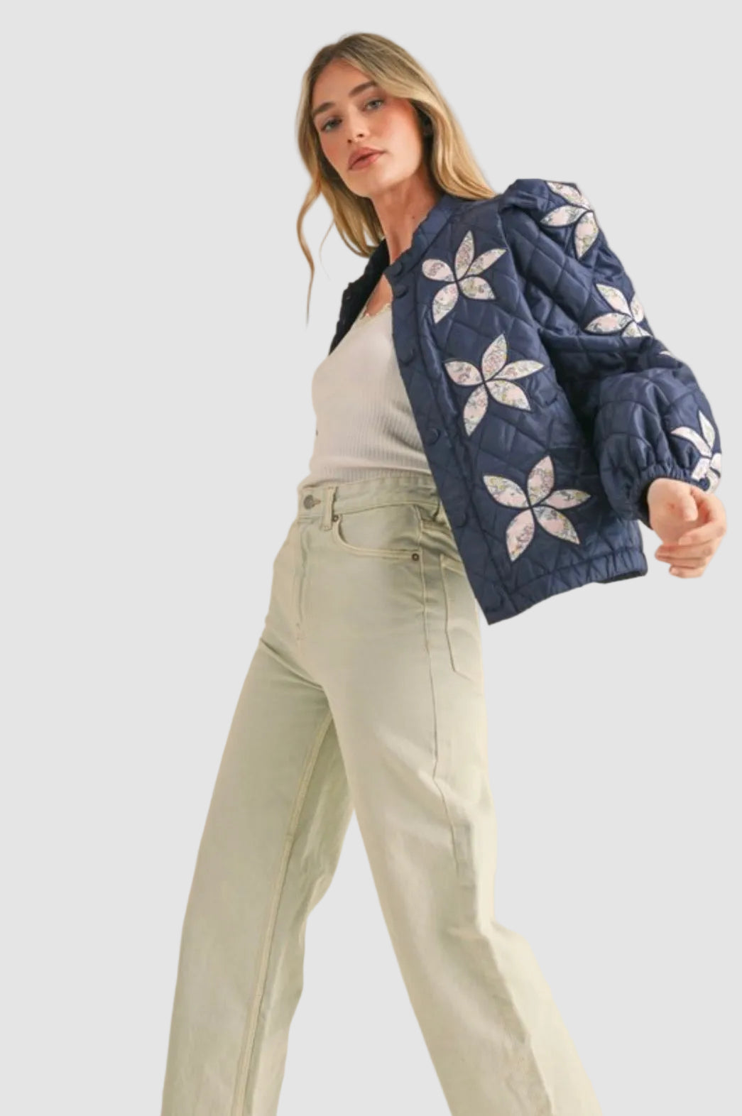 + Gathered puff shoulder long sleeves with elastic cuffs + Embroidered floral patchwork design